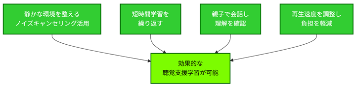 このような工夫により、発達障害の中学生は聴覚支援学習を通じて安心して学びを積み重ねることが可能。