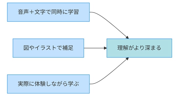 動画教材 | 図や映像で視覚的に理解を助ける | 聴覚と視覚を組み合わせ、理解と記憶が強化される |