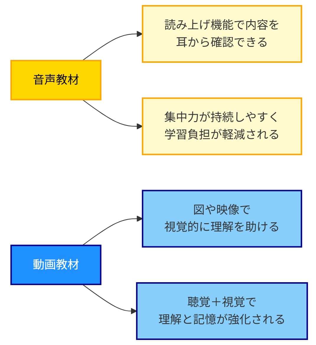 音声教材 | 読み上げ機能で内容を耳から確認できる | 集中力が持続しやすく、学習負担が軽減される |