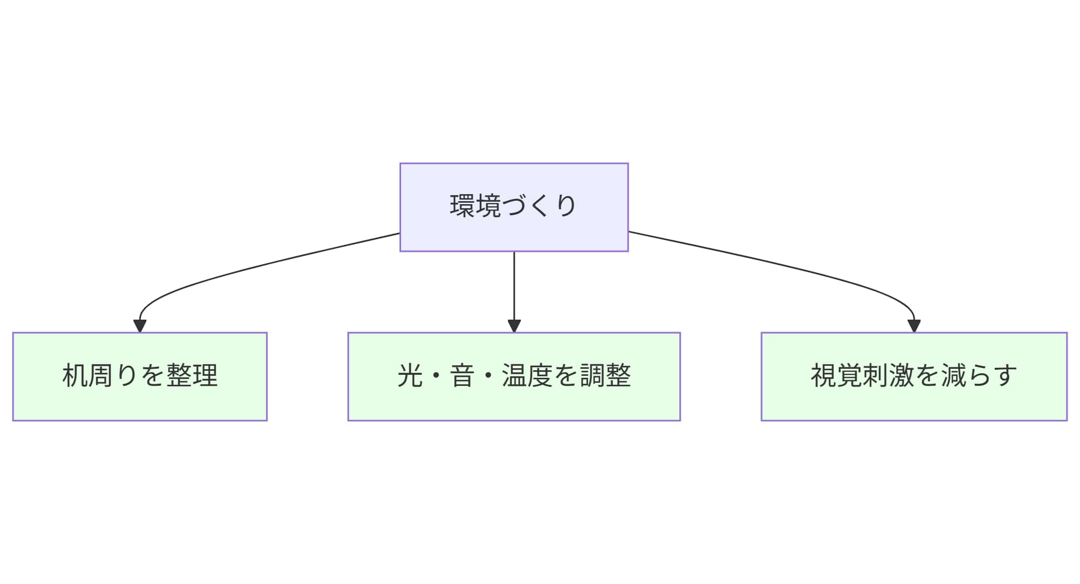 | 環境要因 | 音・光・気温の影響 | 集中しやすい環境を特定して固定化 |