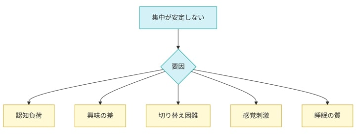 - 音・光・気温など感覚刺激の影響を受けやすく、外部環境によって集中が揺らぐ